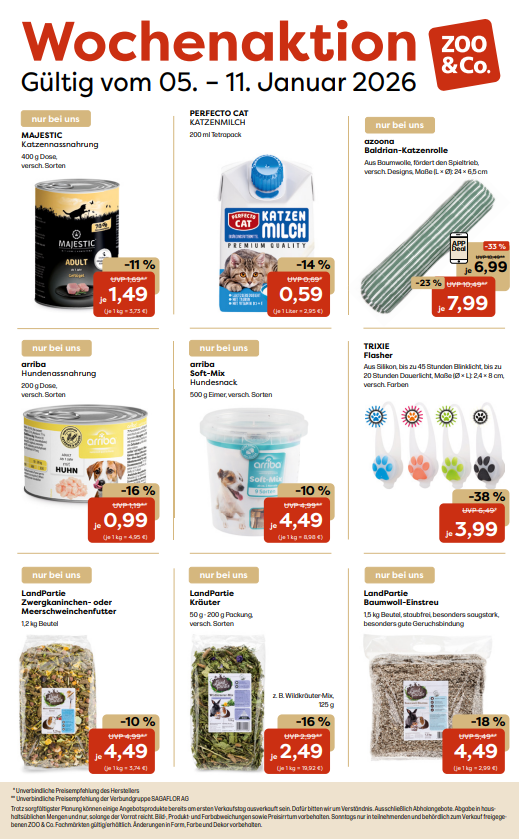Trotz sorgfältigster Planung können einige Angebotsprodukte bereits am ersten Verkaufstag ausverkauft sein. Dafür bitten wir um Verständnis. Ausschließlich Abholangebote. Abgabe in haushaltsüblichen Mengen und nur, solange der Vorrat reicht. Bild-, Produkt- und Farbabweichungen sowie Preisirrtum vorbehalten. Sonntags nur in teilnehmenden und behördlich zum Verkauf freigegebenen ZOO & Co. Fachmärkten gültig/erhältlich. Änderungen in Form, Farbe und Dekor vorbehalten.